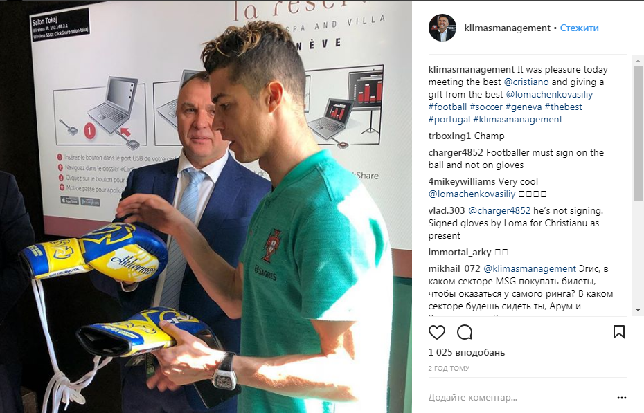 "Было приятно встретиться с лучшим [футболистом] Криштиану Роналду и передать ему подарок от лучшего [боксера] Василия Ломаченко", написал Климас.