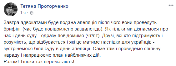 "Все, кто поддерживают и понимают, что происходит и какие это будет иметь последствия для украинцев - встретимся у суда в день апелляции. Там и проведем совместное совещание и выработаем план ближайших действий", - сообщила она.