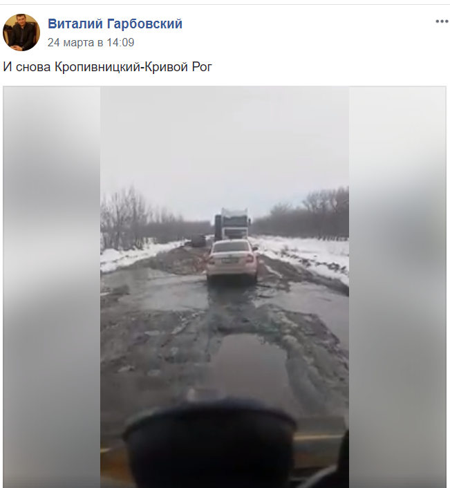 "Это тихий ужас! Отдельные участки дороги Николаев – Кропивницкий – "резервация для индейцев". Водители – на стадии эмоционально-физической деградации… Транспорт может проехать только крупногабаритный. "Мелкие" легковушки заныривают колесами полностью.
