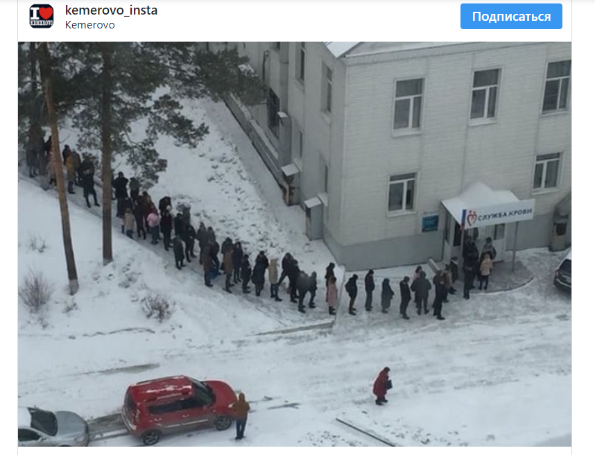 Тем временем жители Кемерово начали массово сдавать кровь для пострадавших при пожаре. Фото очереди на станцию переливания опубликовно в Instagram.
