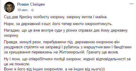 "Суд дал Крысин личную охрану, охрану жилища и имущества. Норм, за государственный счет, его теперь менты охранять. Напомню, что это в очередной раз суды в разных делах дает ему государственную охрану. Правда, прошлые разы, находясь под. государственной охраной он умудрился стрелять на заправке и рубиться с маршутчикамы и бандиты за крышевание перевозок на Житомирской. Гранату еще возил. Ну и ясно, что сотрудники полиции охраны, никакой ответственности за это не понесли", - напомнил Синицин.