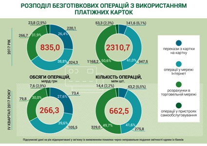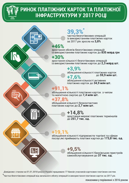 Сообщается, что в 2017 году граждане Украины совершили платежей с использованием банковских карт на общую сумму в 2,125 трлн грн, что на 39% больше в сравнении с показателем 2016 года. Помимо этого было отмечено, что число операций с банковскими картами перевалило за 3 миллиарда.