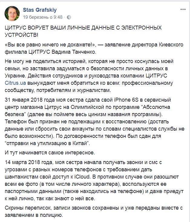 "Я вышел на связь с шантажистами от имени сестры, и один из них проболтался, что давно работает с телефонами от "Цитруса" и от их партнера. Судя по его уверенной манере вести разговор, он шантажирует владельцев телефонов не впервые. И канал перепродажи телефонов, которые якобы уходят на утиль, в "Цитрусе" налажен очень хорошо", – рассказал Графский.