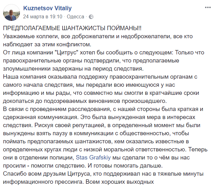 Интересно, что владелец "Цитруса" Виталий Кузнецов, прочитав личное сообщение от Графского, не отвечая, заблокировал его. Об этом сначала заявил сам Стас, а позже признала PR-менеджер компании Юлия Дробышева.