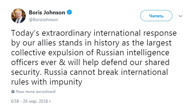 "Сегодняшняя экстраординарная международная реакция наших союзников останется в истории как величайшее коллективное выдворение российских работников разведки, которая когда-либо имела место, и поможет защитить нашу общую безопасность. Россия не может нарушать международные правила безнаказанно", - подчеркнул британский министр.