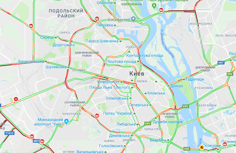 На Левом берегу пробки на Броварском проспекте, улице Шолом-Алейхема, бульваре Перова, на проспекте Ватутина.