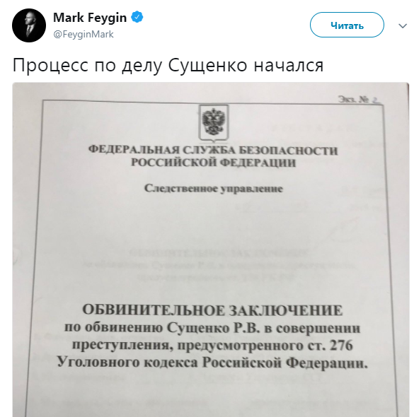 Также мы писали, что Фейгин заявил, что от Сущенко требуют признания в шпионаже.
