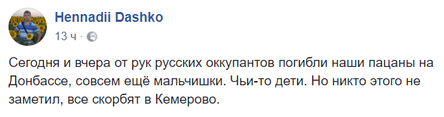 "Сегодня и вчера от рук русских оккупантов погибли наши пацаны на Донбассе, совсем ещё мальчишки. Чьи-то дети. Но никто этого не заметил, все скорбят в Кемерово", – возмущенно написал он в Facebook.