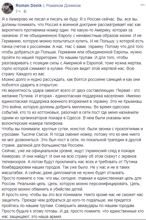 "Сейчас, уже на официальном уровне, ищут украинский след в пожаре Кемерово. И они найдут. И они на всю страну об этом скажут с экранов телевизоров. А потом будут проклинать нас всех и требовать от Путина бомбардировки наших городов. Так уже было. Не у нас и не в таких масштабах. А сейчас даже дипломатов не нужно будет отзывать.