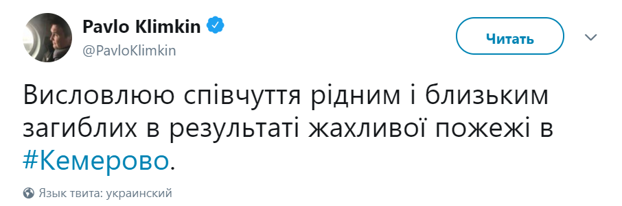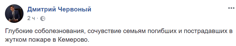 "Глубокие соболезнования, сочувствие семьям погибших и пострадавших в жутком пожаре в Кемерово", – пишет киевский адвокат Дмитрий Червоный.