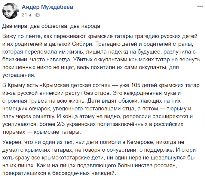 "Уверен, что ни один из тех, чьи дети погибли в Кемерове, никогда не думал о крымских татарах, не говоря о сочувствии, о поддержке. И сгори хоть сразу все крымскотатарские дети, ни один нерв не шевельнулся бы на их лицах", – написал он в Facebook, рассказывая о детях крымских татар, чьих отцов арестовали в Крыму.