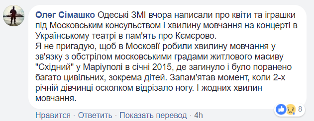 "Одесские СМИ вчера написали о цветах и ​​игрушках под Московским представительством и минуте молчания на концерте в украинском театре в память о Кемерово.