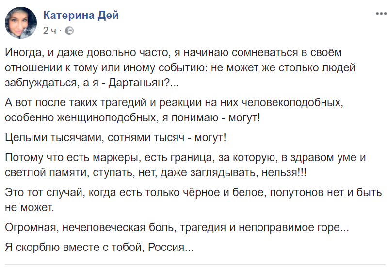 Я скорблю вместе с тобой, Россия..." – пишет блогер Екатерина Дей из Днепра.