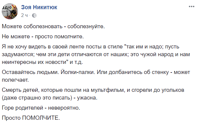 Надеюсь, Кемерово не будет судить о реакции украинцев по этому жестокому розыгрышу. В моей ленте фейсбука не было никого, который бы писал об этой ужасной трагедии без скорби по погибшим детям.