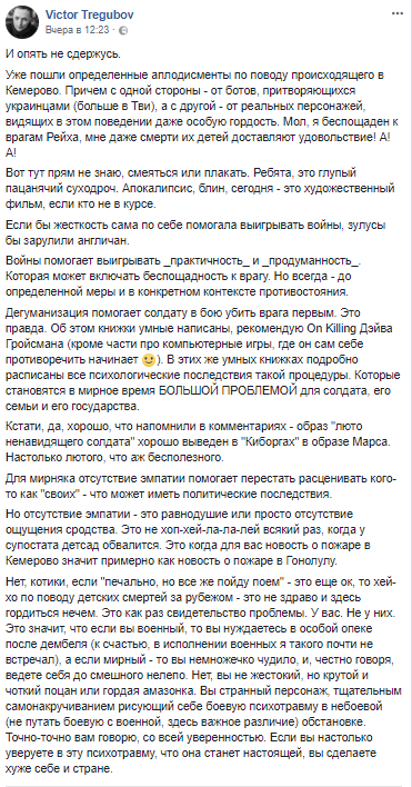 "Уже пошли определенные аплодисменты по поводу происходящего в Кемерово. Причем с одной стороны – от ботов, притворяющихся украинцами (больше в Тви), а с другой – от реальных персонажей, видящих в этом поведении даже особую гордость. Мол, я беспощаден к врагам Рейха, мне даже смерти их детей доставляют удовольствие!" – пишет журналист Виктор Трегубов.