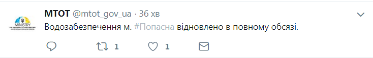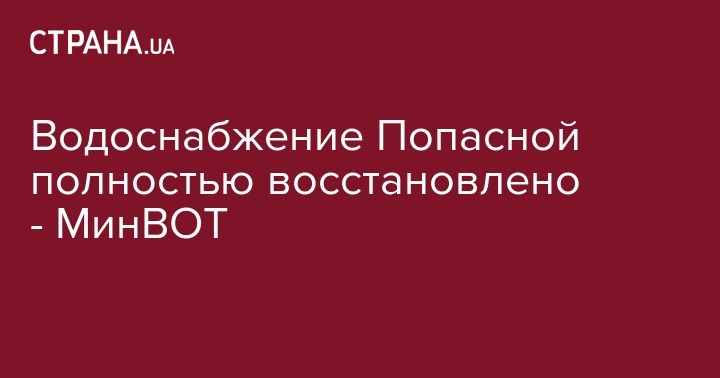 "Водообеспечение г.Попасная восстановлено в полном объеме", - сказано в сообщении МинВОТ в микроблоге Твиттер во вторник.