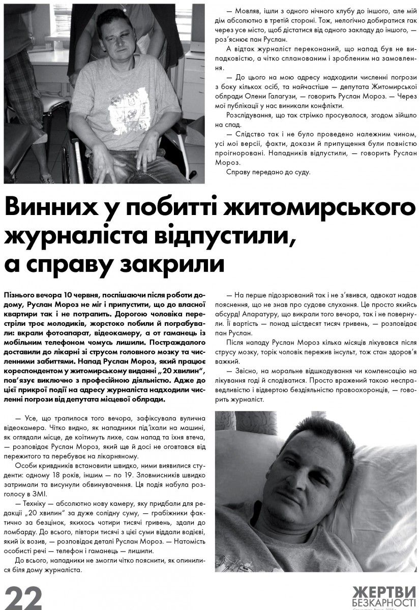 Украинская общественная организация "Институт массовой информации" заявляет, что нападение на журналиста газеты "20 минут Житомир" Руслана Мороза является всего лишь бытовым преступлением. Однако сам пострадавший с 20-летним стажем журналистской деятельности расценивает случившееся нападение как имеющее заказной характер.