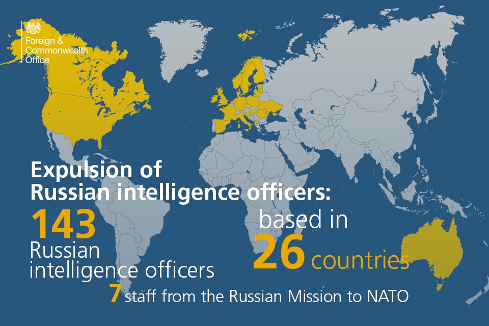 Министерство иностранных дел Великобритании и Северной Ирландии заявило, что уже 26 стран выдворили 143 российских сотрудника разведки, которые выдавали себя за дипломатов, в связи с отравлением в Солсбери бывшего российского разведчика Сергея Скрипаля и его дочери Юлии.
