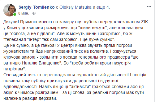 "В центре Киева звучат прямые угрозы журналистам и идет неприкрытое давление на коллектив. И озвучивается ключевое требование - освободить от должности генерального продюсера "это ватницу Наталью Влащенко". Ибо "надо делать шаги навстречу патриотам". Очевидное давление и препятствование журналистской деятельности! И полиция должна такую ​​публику привлекать к реальной и ощутимой ответственности. Даже если эти "активисты" играют словами или эта акция является чьим-то розыгрышем - за эти слова, реальные угрозы должна быть надлежащая реакция государства",  - написал он.