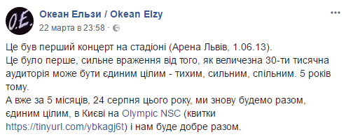 Группа Святослава Вакарчука "Oкеан Эльзы" даст концерт на стадионе "Олимпийский" 24 августа 2018 года, в День Независимости. Об этом сообщается на странице группы в Facebook.
