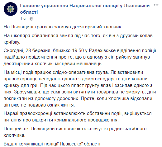 В среду, 28 марта во Львовской области в результате обвала грунта самодельного укрытия погиб 10-летний мальчик. "Криивку" дети устроили недалеко от частного домохозяйства.