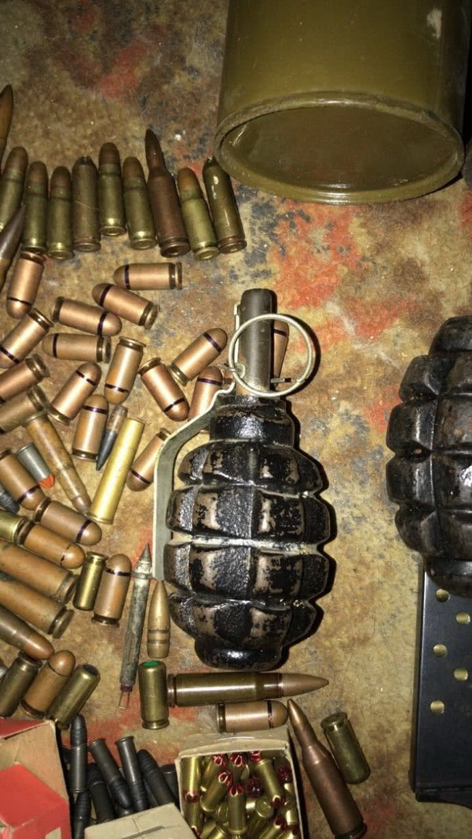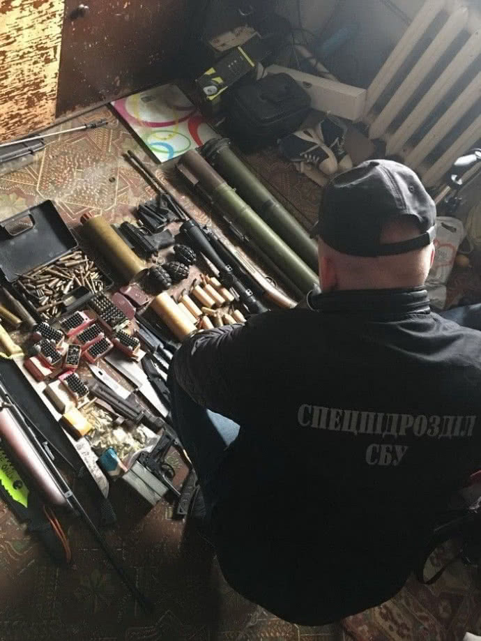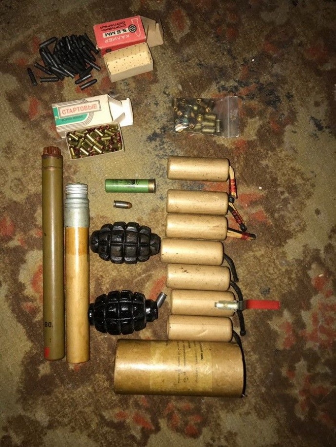 Во время обысков по месту его проживания и работы правоохранители изъяли семь пистолетов и револьверов, три гранаты Ф-1, тротиловую и дымовую шашки, семь взрывпакетов, сигнальную мину, семь единиц холодного оружия и около тысячи патронов различного калибра.