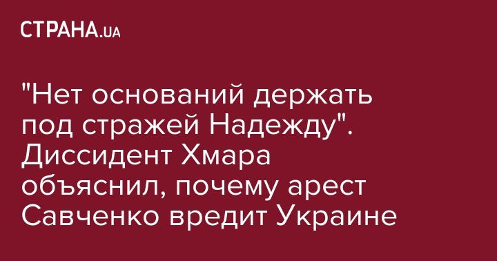 "Авантюра не пройдет. Нет оснований держать под стражей Надежду. Я не говорю виновата она или нет. Я сочувствую ей. И считаю неправильным использование элементов шантажа и авантюризма в политике, потому что это до добра не приводит. Она молодой политик. Она научится. Она оригинальный человек. Она способная и дай бог ей, чтобы она не разрушала свое здоровье под стражей, а могла вместе с мамой, там, писанки писать и ходить к следствию хоть каждый день. Я знаю, что она будет это делать и гарантирую, что она никуда не убежит. Потому что ей некуда бежать. И нет смысла бежать", утверждает Хмара.