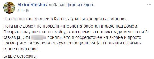 "Я всего несколько дней в Киеве, а у меня уже для вас история. Пока мне домой не провели интернет, я работал в кафе под домом. Говорил в наушниках по скайпу, в это время за столик сзади меня сели 2 кавказца. Эти ... поняли, что я сосредоточен на экране и просто посмотрите на эту ловкость рук. Вытащили 350$. В полиции выразили вялое сожаление. Будьте осторожны", - написал он.