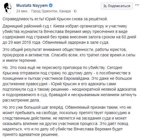"Сегодня Крысина отправили под стражу по другому делу - о пособничестве в похищении и пытках участников Евромайдана. Это даже не большое достижение правосудия - Юрий Крысин и его адвокаты сами подтолкнули суд к такому решению - неоднократной неявкой адвокатов и подозреваемого в суд, бравадой и нескрываемым желанием затянуть рассмотрение дела", - пишет Найем.
