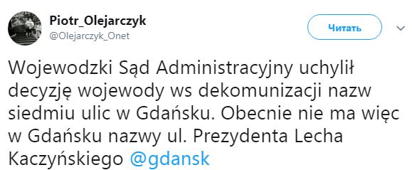 "Воеводский административный суд отменил решение воеводы о декоммунизации семи улиц в Гданьске. На данный момент в Гданьске нет названия "улица президента Леха Качиньского", - указано в сообщении.