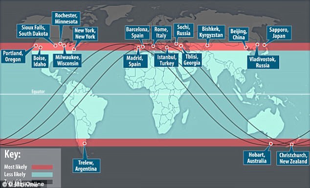 В зону возможного падения обломков станции входят Португалия, Испания, Италия, Греция, Турция, территории центральноазиатских республик (за исключением Казахстана), Китай, Япония, вся Африка, страны Азии, Океании, Австралия, США, Мексика, страны Центральной и Южной Америки.
