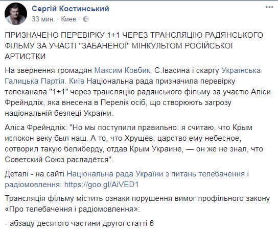 Он говорит, что проверку начнут по обращению граждан Максима Ковбика, С.Ивасина и жалобы Украинской галицкой партии. Также Костинский приводит цитату Алисы Фрейндлих, из-за которой она попала в черный список: "Но мы поступили правильно: я считаю, что Крым испокон веку был наш. А то, что Хрущев, царство ему небесное, сотворил такую белиберду, отдав Крым Украине, — он же не знал, что Советский Союз распадется".