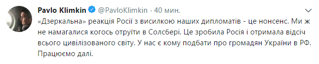 "Зеркальная" реакция России с высылкой наших дипломатов - это нонсенс. Мы же не пытались кого-либо отравить в Солсбери. Это сделала Россия и получила отпор всего цивилизованного мира. У нас есть кому позаботиться о гражданих Украины в РФ. Работаем дальше", - написал министр.