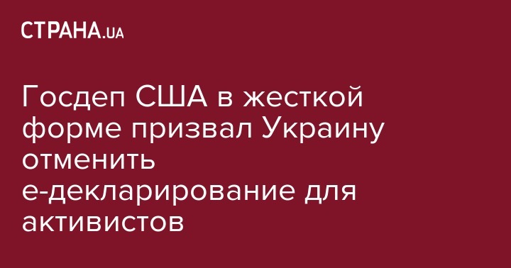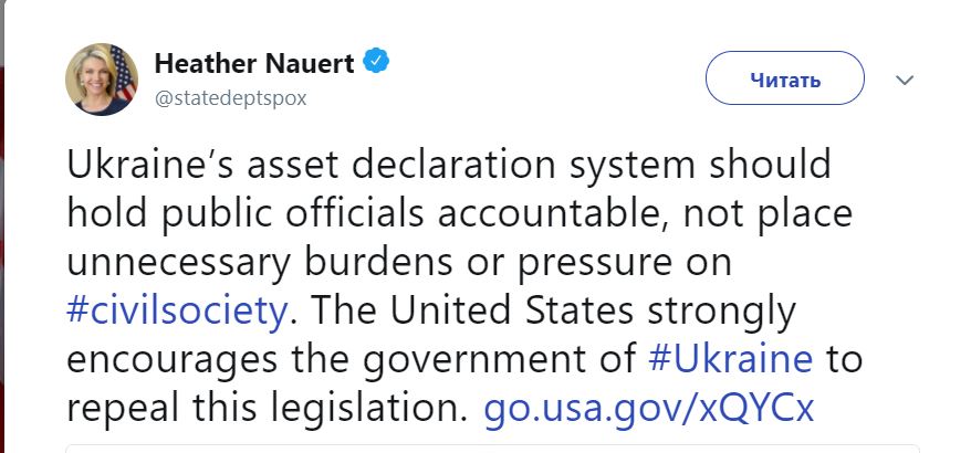 "Украинская система декларирования должна привлекать к ответственности государственных должностных лиц, а не создавать ненужные трудности или давление на гражданское общество. Соединенные Штаты настоятельно рекомендуют правительству # Ukraine отменить эту норму закона", - говорится в сообщении.