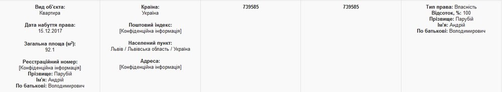 Как и прежде, Парубий декларирует свое право пользоваться квартирой площадью 42 кв.м во Львове, а также право собственности супруги на квартиру (22 кв.м) в этом же городе, жилой дом (32 кв.м) и земельный участок в Урыче Сколивского района Львовской области. У супругов, как в предыдущих декларациях, есть два автомобиля.