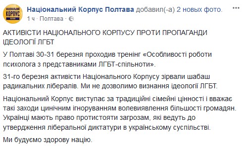 Сегодня, 31 марта, в Полтаве активисты "Национального Корпуса" сорвали тренинг "Особенности работы психолога с представителями ЛГБТ-сообщества". Об этом сообщается на странице организации в Facebook.