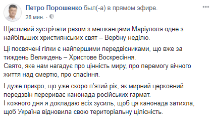 "Счастлив встречать вместе с жителями Мариуполя один из величайших христианских праздников - Вербное воскресенье", - приводится цитата президента.