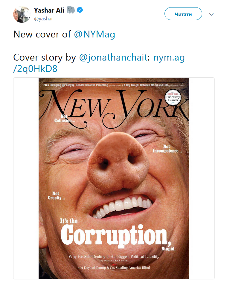 Обложку нового номера украсит фото президента США со свиным пятачком. Скандальную обложку выложил в Twitter корреспондент издания Яшар Али.