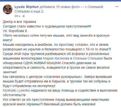 В Днепре убили большое количество летучих мышей, занесенных в Красную книгу. Животных, которые находились в спячке, выбросили с 16 этажа жилого дома. Об этом сообщила волонтер Людмила Шпитун на своей странице в соцсети Facebook.