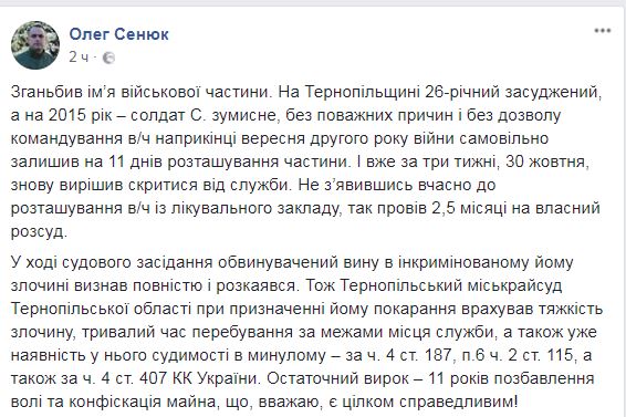 "Опозорил имя воинской части. На Тернопольщине 26-летний осужденный, а на 2015 год – солдат С., умышленно, без уважительных причин и без разрешения командования в/ч в конце сентября второго года войны самовольно оставил на 11 дней расположение части. И уже через три недели, 30 октября, снова решил спрятаться от службы, не появившись вовремя в расположении в/ч из лечебного заведения, так провел 2,5 месяца по собственному усмотрению", - написал он.