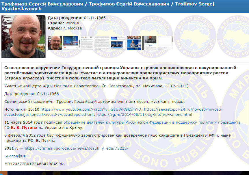 Российский певец Сергей Трофимов оказался в базе сайта "Миротворца" за выступления в аннексированном Крыму и поддержку политики президента России Владимира Путина. Об этом сообщается на сайте "Миротворца".