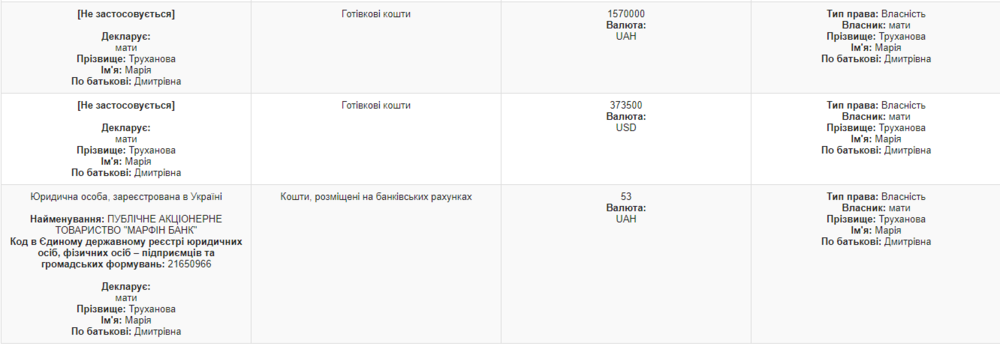 Наличные средства его матери Марии Трухановой остались неизменными - 1 млн 570 тысяч гривен и $373 500