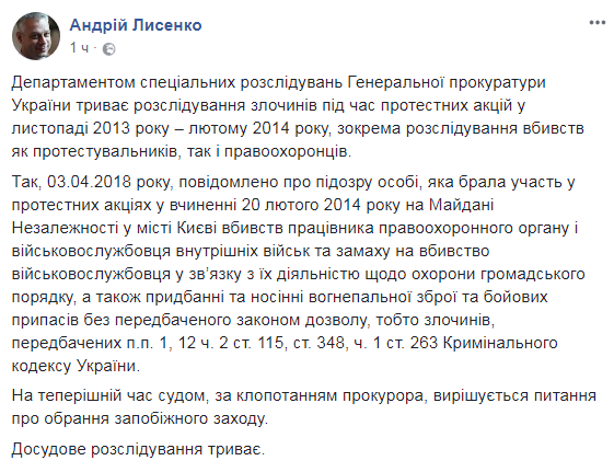"03.04.2018 года сообщено о подозрении лицу, принимавшему участие в протестных акциях, в совершении 20 февраля 2014 года на Майдане Независимости в Киеве убийств сотрудника правоохранительного органа и военнослужащего внутренних войск и в покушении на убийство военнослужащего в связи с их деятельностью по охране общественного порядка, а также в приобретении и ношении огнестрельного оружия и боеприпасов без предусмотренного законом разрешения, то есть преступлений, предусмотренных п.п. 1, 12 ч. 2 ст. 115, ст. 348, ч. 1 ст. 263 Уголовного кодекса Украины", - написал Лысенко.