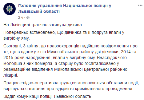 Трехлетняя девочка погибла после падения в выгребную яму, ее четырехлетняя подружка - в реанимации районной больницы, сообщает отдел коммуникации главного управления Национальной полиции во Львовской области.