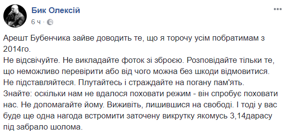"Арест Бубенчика лишний раз доказывает то, что я твержу всем побратимам с 2014 года. Не отсвечивать. Не публиковать фоток с оружием. Рассказывайте только то, что невозможно проверить или от чего можно без ущерба отказаться. Не подставляться. Путайтесь и жалуйтесь на плохую память.