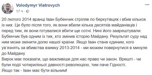 Глава института Нацпамяти Владимир Вятрович также считает, что результат "дела Бубенчика" может вернуть Украину в прошлое. Попутно в своем посте Вятрович прямо утверждает, что майдановец убил несколько милиционеров. Но предлагает списать это на "революционную необходимость".