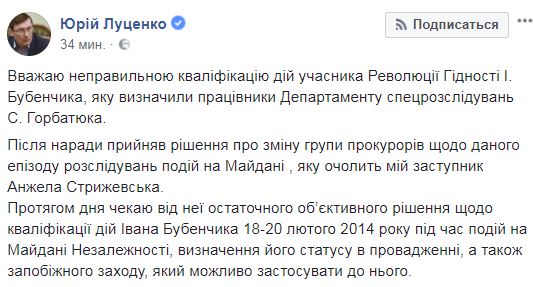 Таких комментариев среди сторонников Майдана – десятки. Возможно, поэтому генпрокурор Юрий Луценко сегодня "дал заднюю". Он заявил, что забирает дело Бубенчика у следователя Сергея Горбатюка (который ведет дело по убийствам в центре Киева) и передает его другой группе прокуроров – мол, подчиненные Горбатюка неправильно определили статью.