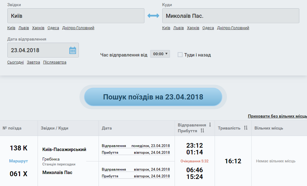 Как оказалось, на сайте бронирования билетов "Укрзализныци" действительно нельзя купить билеты из столицы в Днепр, Херсон, Запорожье и Николаев с 23 апреля – система сообщает, что поезда отсутствуют.