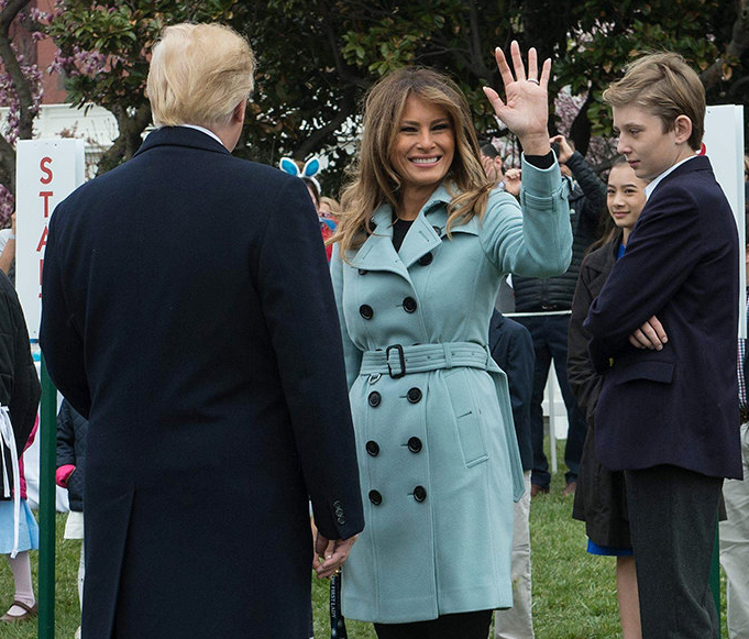 Первая леди была в нежно-голубом кашемировом тренче Burberry за 2595 долларов, черных джинсах и замшевых сапогах почитала детям сказку, а затем отправилась на прогулку по лужайке вместе с супругом и сыном Бэрроном, периодически получая от довольного мужа поцелуй - назло всем слухам, в семье Трамп все отлично.
