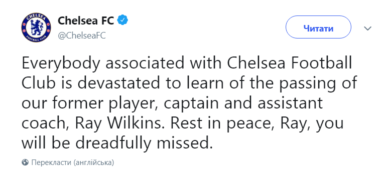 "Мы совершенно опустошены и огорчены новостью о смерти нашего бывшего игрока, капитана и помощника главного тренера. Покойся с миром, Рэй Уилкинс. Тебя будет не хватать", - написано в официальном твиттер-аккаунте "Челси".
